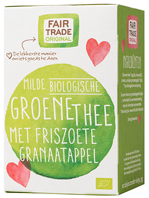 Groene thee* (93,5%), natuurlijk aroma, stukjes granaatappel* (3%).