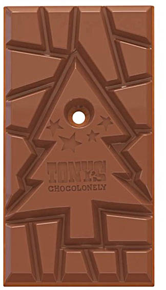 Ook dit jaar komt Tony’s Chocolonely weer met speciale Kerstrepen. De repen zijn voorzien van een handig gat, zodat je ze eventueel in een kerstboom zou kunnen hangen.