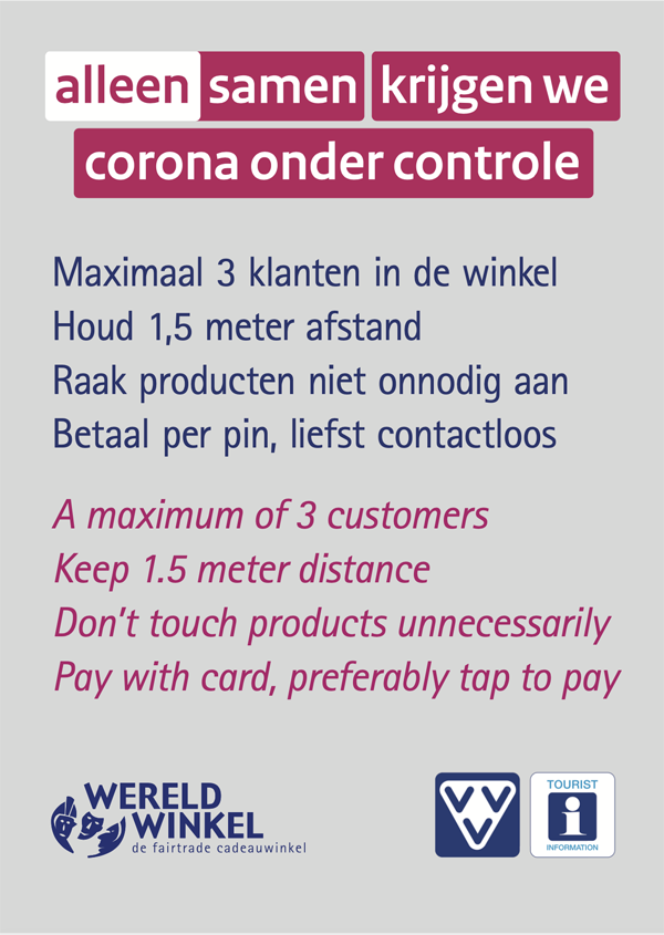Maar we gaan vanaf vrijdag 22 mei weer open. Daar voelen we ons toe verplicht. De producenten in de derdewereldlanden zijn immers nu meer dan ooit afhankelijk van onze verkopen. We gaan proberen om dat zo veilig mogelijk te doen. Het interieur van de winkel is aangepast om te voldoen aan de 1,5 meter afstand die nu verplicht is. Er hangt een Coronascherm bij de kassa en we plaatsten een extra scheidingstafel bij de VVV-informatie.