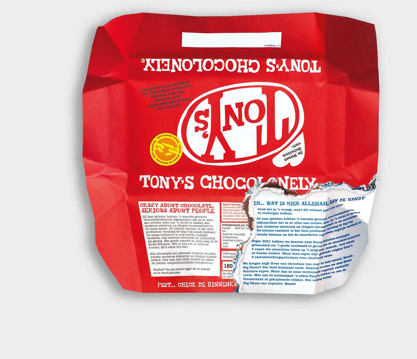 Daarom blijven deze Sweet Solution-repen verkrijgbaar, maar dan in onze vertrouwde ongelijke vorm. Met aan de buitenkant ’n vertrouwde Tony’s wikkel, maar aan de binnenkant nog steeds die gekopieerde wikkel! De boodschap erachter is bedoeld om slavernij in de choco-industrie te bekritiseren: de bedrijven moeten sámen de schouders zetten onder deze bittere problematiek. “We zijn allemaal onderdeel van het probleem en kunnen allemaal onderdeel zijn van de Sweet Solution”, stelt Tony’s.