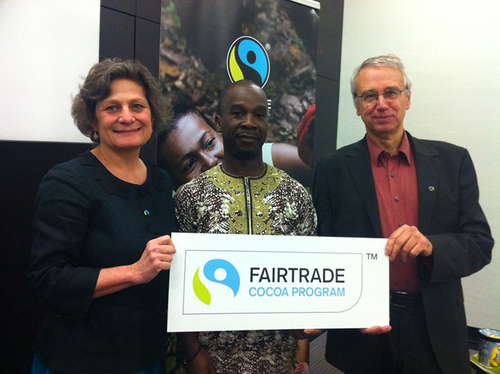 Harriet Lamb, de CEO van Fairtrade International (links) met Fortin Bley, de Secretaris-Generaal van de CANN Coöperatie in Ivoorkust en Dieter Overath, de CEO van Fairtrade Duitsland tijdens de lancering van de nieuwe Fairtrade Sourcing Programs in Keulen.