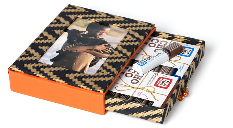 Ook goed om te weten: de chocoladereepjes zijn gemaakt met cacao en rietsuiker van fairtrade boeren in Afrika en Latijns Amerika. Dankzij deskundige landbouwvoorlichting neemt hun oogst jaarlijks toe en wordt bij productie het milieu ontzien. En dat maakt het bijzondere verhaal achter dit unieke choco-lade-doosje helemaal compleet. Inderdaad, een opvallend verhaal, de moeite waard om in te lijsten.